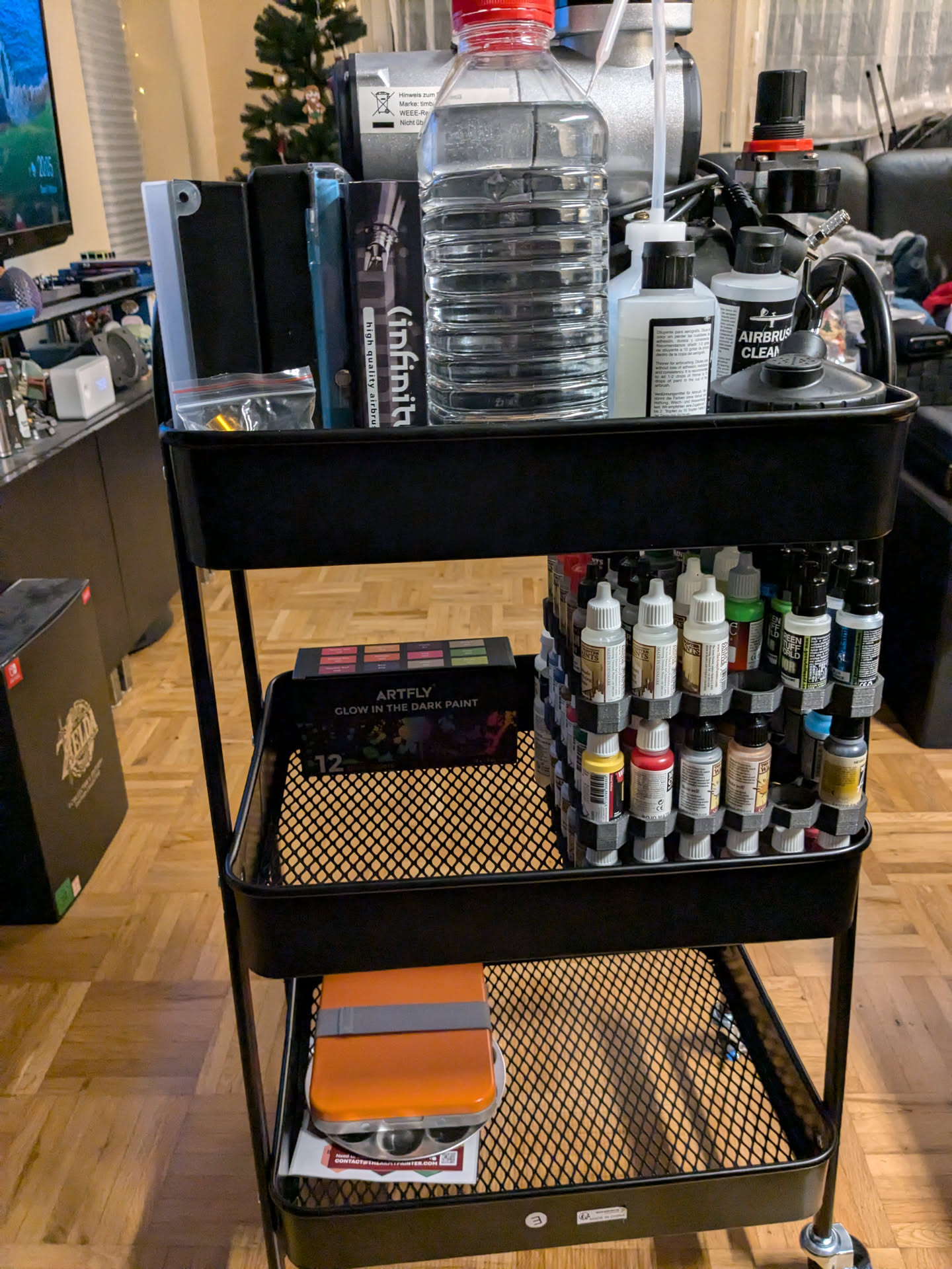 That also prompted me to finally kit up my painting stuff on a small cart that fits into the freshly cleaned up built-in closet.